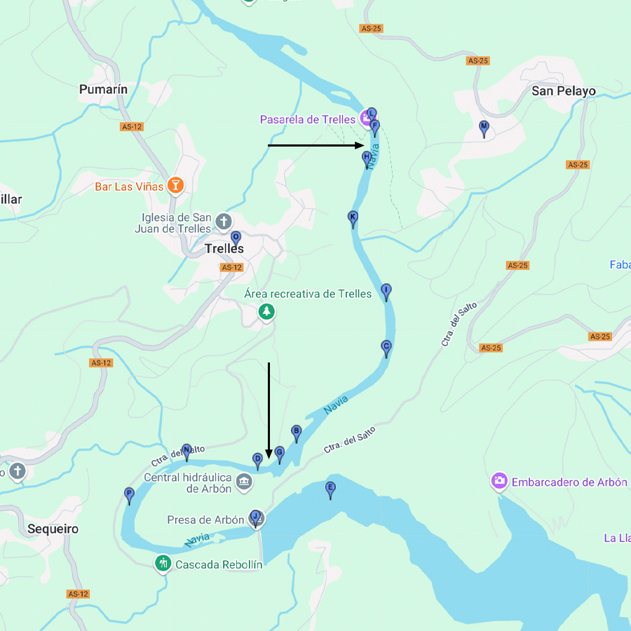 LOS 3 COTOS DE SALMÓN DEL RÍO NAVIA, PINCHANDO SOBRE LOS NOMBRES DE LOS COTOS SE DESPLEGARÁ EL PLANO DE UBICACIÓN DE SUS POZOS DE SALMÓN Y ZONAS DE APARCAMIENTO.